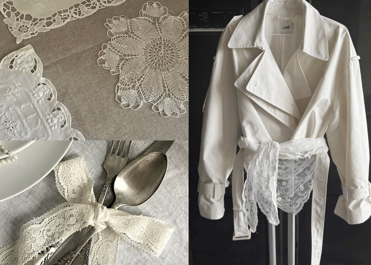 Há poucos dias, vi uma imagem que me chamou atenção: um trench coat branco, minimalista, ajustado com uma renda antiga no lugar do cinto, daquelas rendas que todo mundo já viu em casa de vó, entre panos de prato bordados e guardanapos guardados há anos.