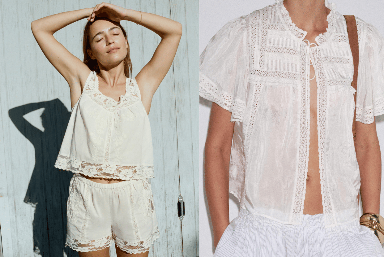 Já a Zara, do lado comercial da cadeia, incorporou a renda em várias propostas, aqui alguns exemplos: ela como acabamento ornamental e estrutura visual ao mesmo tempo, presente nas alças, na barra da blusa, nas laterais e na barra do short, mas com um toque leve, desenho floral da renda delicado, com transparência.