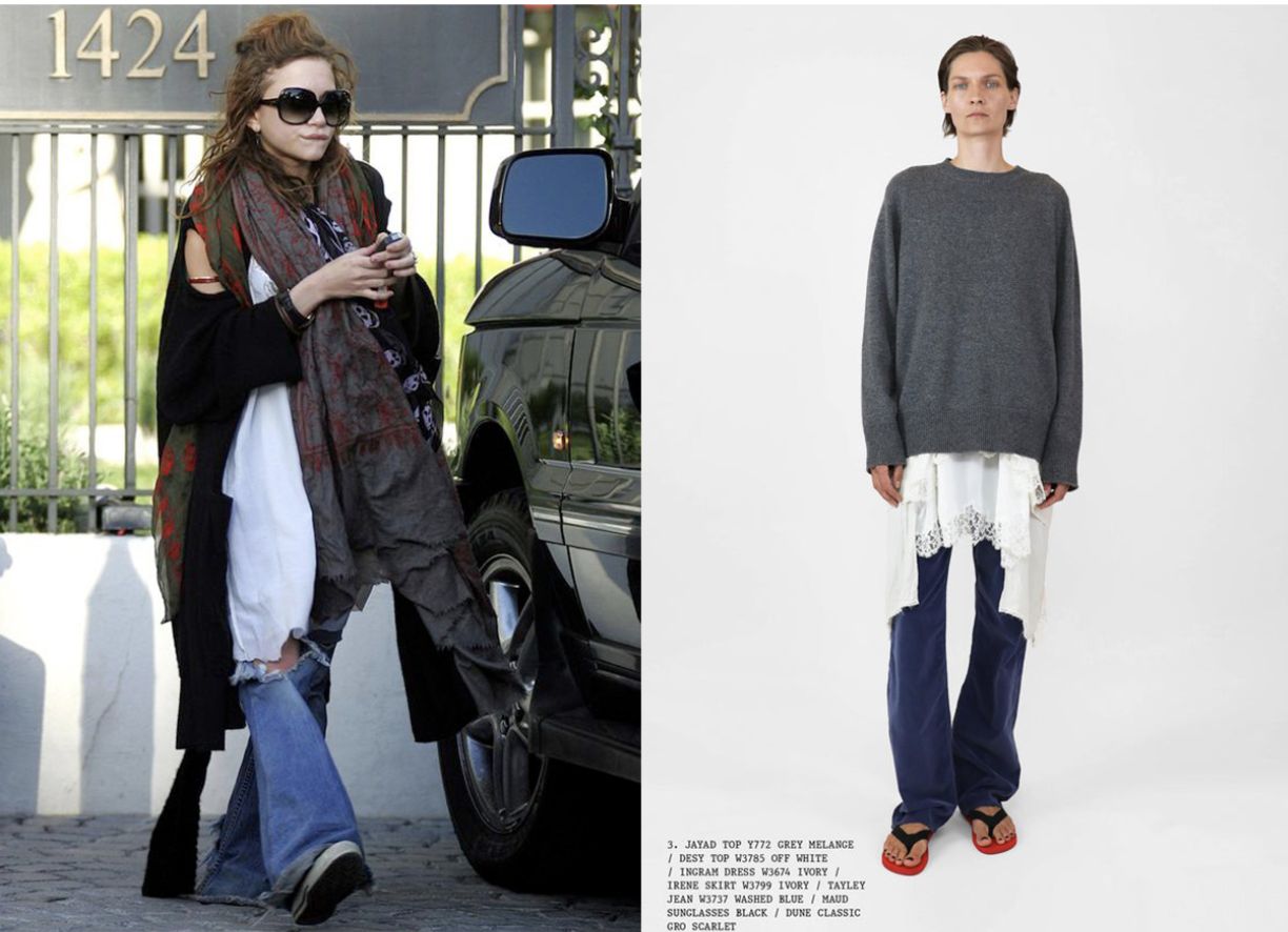 Aqui, a renda aparece de forma ainda mais intencional como acabamento de uma peça sobreposta, provavelmente uma combinação de vestido e saia em camadas, sob um suéter oversized cinza. Ela tem um desenho floral delicado, feito provavelmente em algodão, com bicos irregulares que se projetam para fora da silhueta.