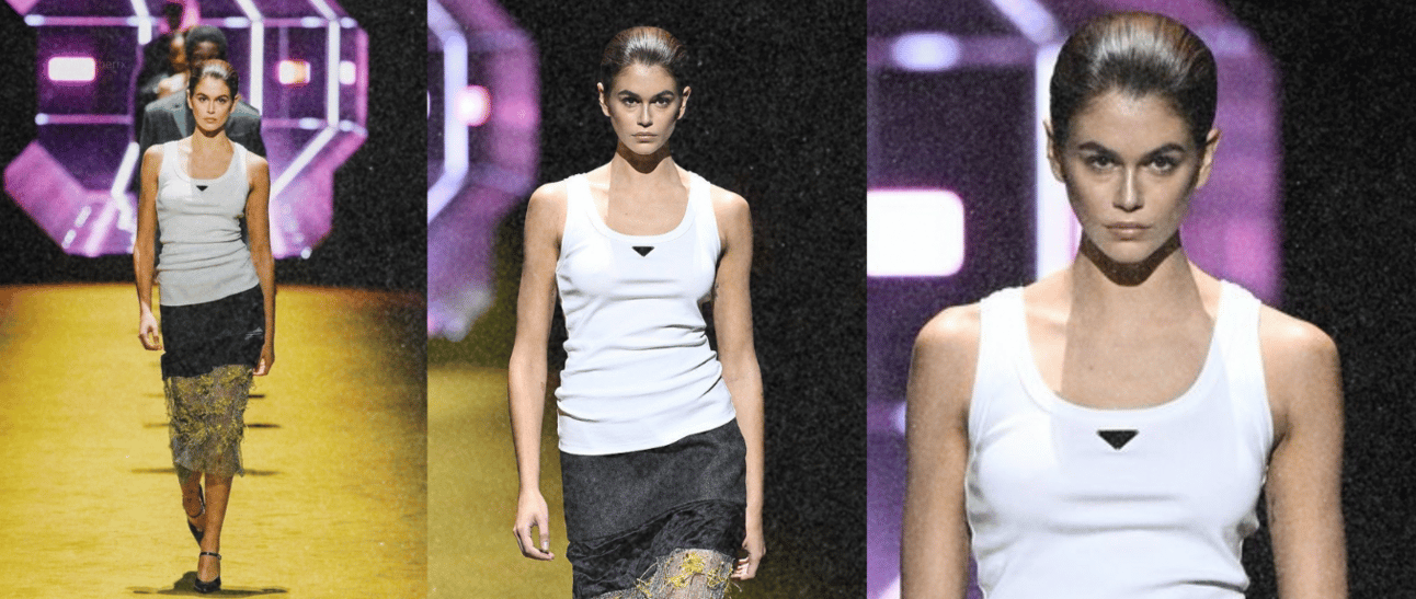 Todo mundo que acompanha moda lembra: foi a regata que abriu o desfile da Prada na coleção Primavera/Verão 2023, em setembro de 2022, desfilada por Kaia Gerber.