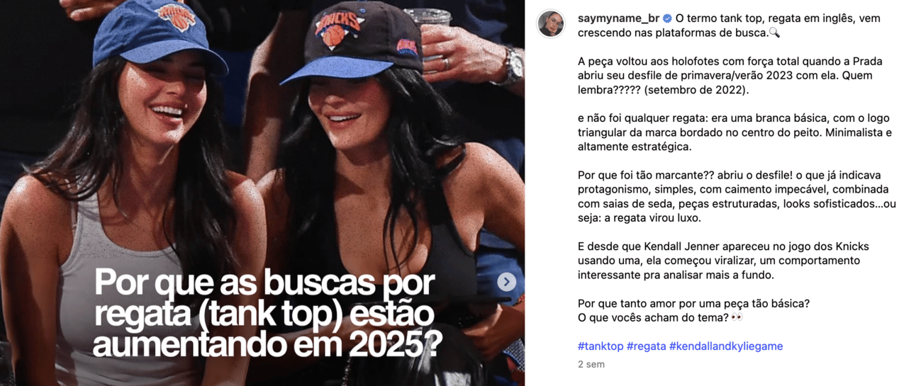 A peça atingiu seu pico histórico de interesse no Pinterest em 2025, como mostram os gráficos de comportamento, um crescimento consistente desde dezembro de 2024, com um salto ainda maior após a aparição de Kendall Jenner com a peça no jogo dos Knicks em maio passado, que gerou mais de 46 milhões de buscas em sete dias no TikTok.