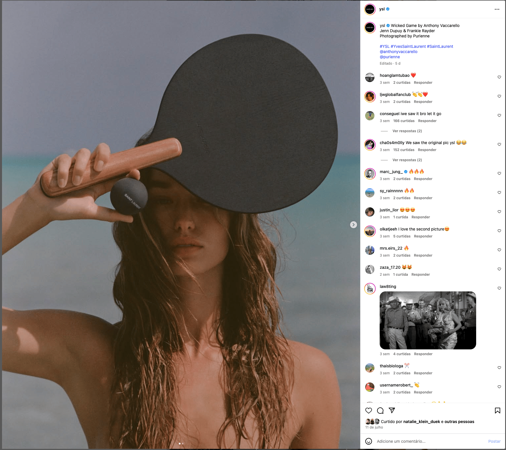 A imagem deste posta da YSL remete aos anos 1970 ou início dos 1990, com textura granulada, luz natural e cores suavizadas, como se tivesse sido clicada em um filme. Isso gera nostalgia, autenticidade e um contraste direto com os visuais hiperpolidos das redes sociais.