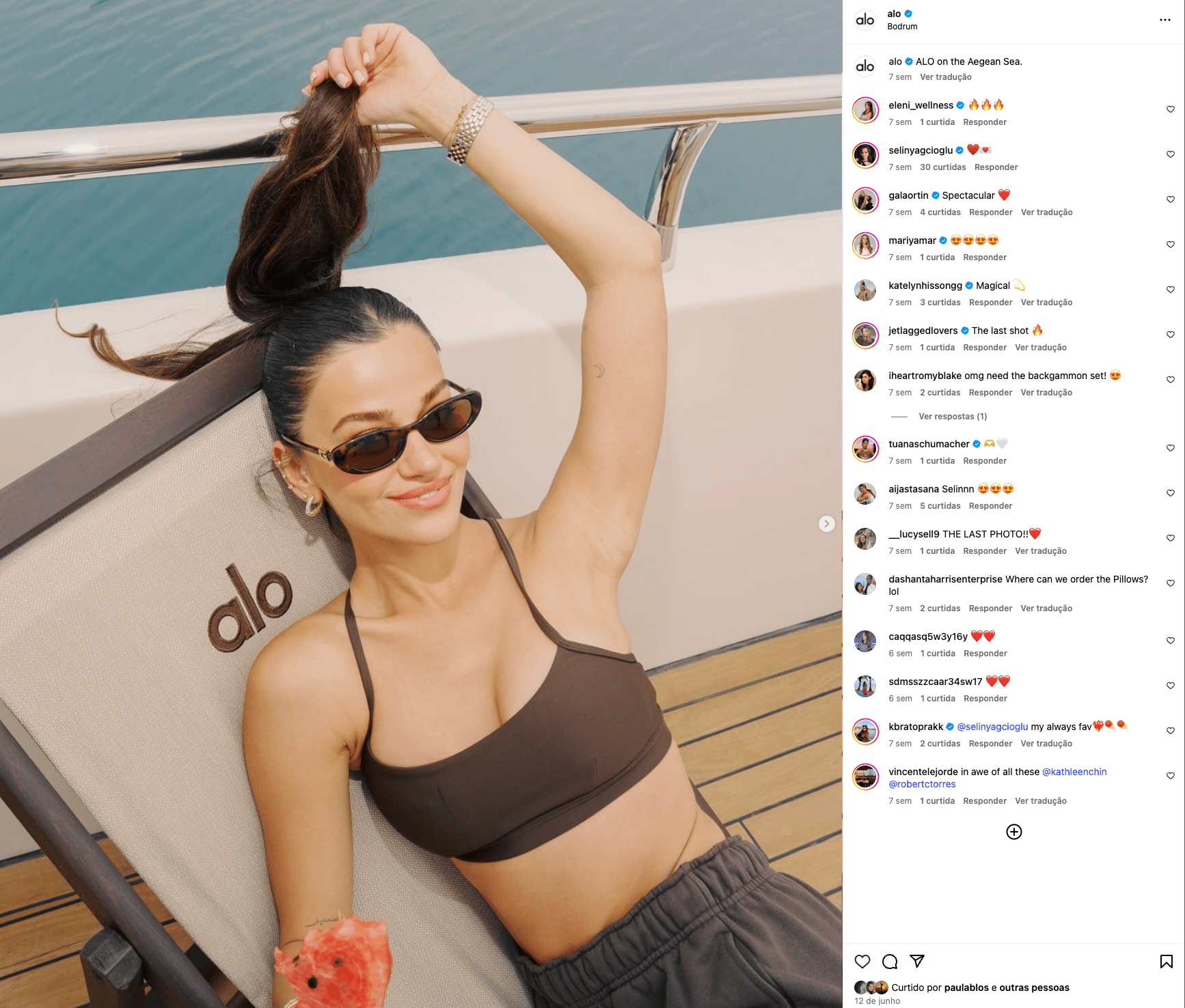 Neste post da Alo, o sorriso relaxado da modelo, o brilho do sol refletido na água e o alimento natural (melancia) são detalhes simbólicos que reforçam uma narrativa de vida boa, saudável e em equilíbrio. A marca comunica e vende uma sensação de férias, saúde, autocuidado e sucesso suave.