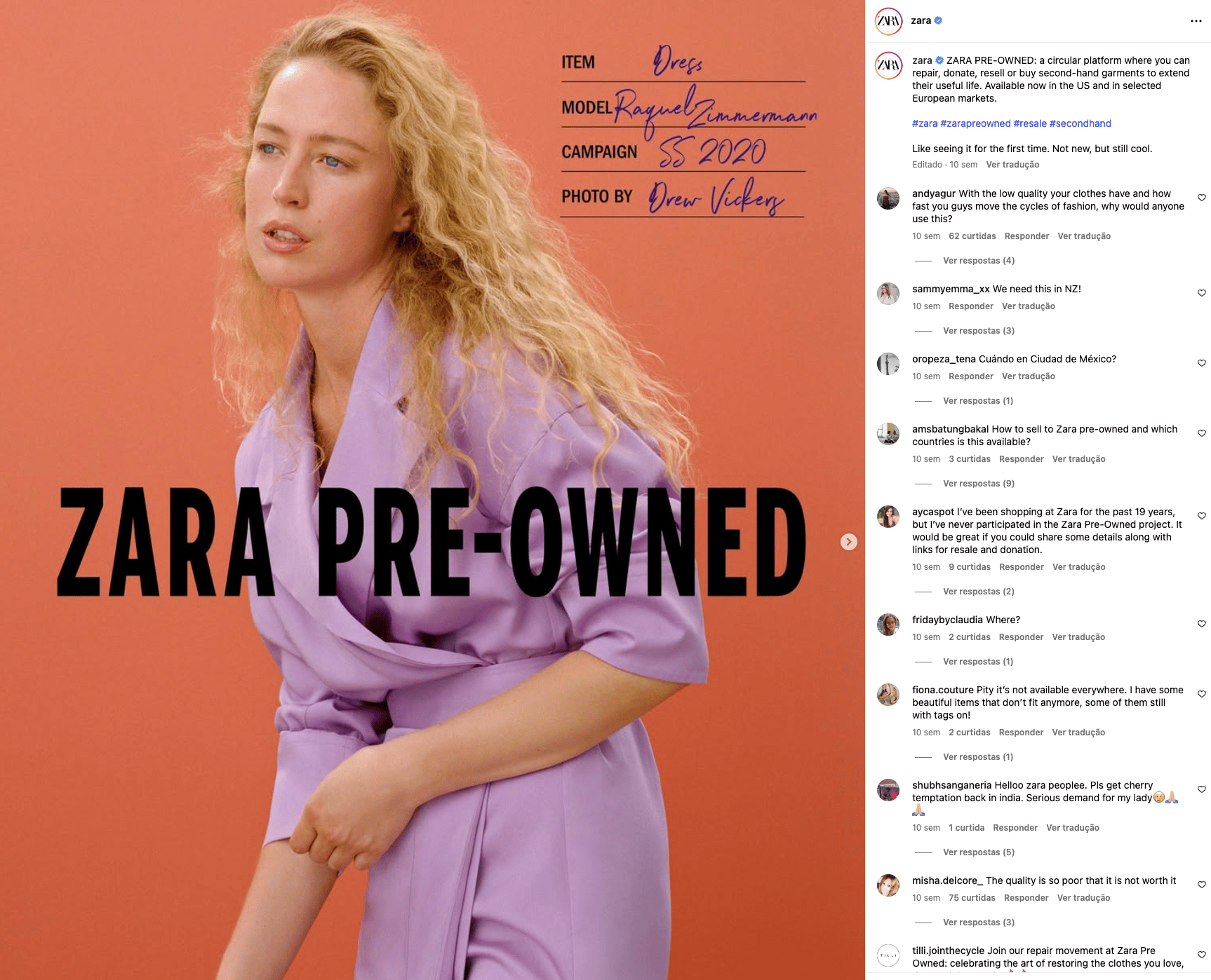 Sim, a Zara, uma gigante do fast fashion, pode e deve ter e promover práticas sustentáveis. E faz isso através da sua plataforma pre-owned de revenda de peças usadas. O post não soa como “greenwashing” porque não usa clichês visuais de sustentabilidade (plantas, tecidos crus, paisagens). Em vez disso, aposta numa linguagem visual elegante e adulta, que posiciona o Pre-Owned como parte da própria moda e não apenas um projeto paralelo ou emergencial.
